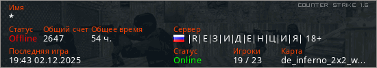 Последний раз был в сети 19:43 02.12.2025 Игрок с таким ником замечен на 49 серверах
