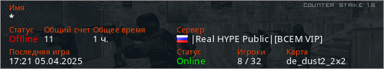 Играет на Counter Strike 1.6 сервере. Страна: РоссияПервый раз замечен 13:38 21.02.2024