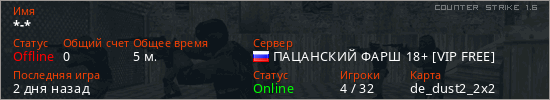 Играет на Counter Strike 1.6 сервере. Страна: РоссияПервый раз замечен 12:14 10.03.2026