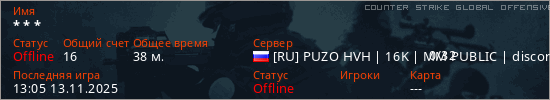 Играет на Counter Strike Global Offensive сервере. Страна: РоссияПервый раз замечен 10:15 09.04.2025