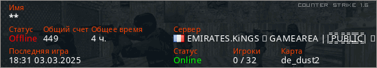 Последний раз был в сети 18:31 03.03.2025 Игрок с таким ником замечен на 28 серверах