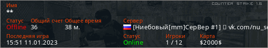 Последний раз был в сети 15:51 11.01.2023 Игрок с таким ником замечен на 28 серверах