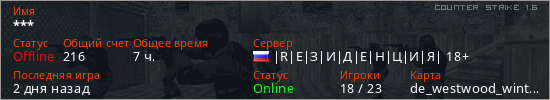Играет на Counter Strike 1.6 сервере. Страна: РоссияПервый раз замечен 14:56 06.08.2019