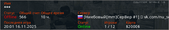 Последний раз был в сети 20:01 16.11.2025 Игрок с таким ником замечен на 40 серверах