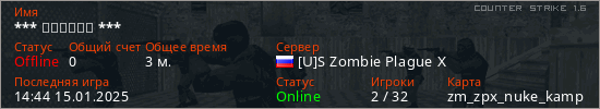 Играет на Counter Strike 1.6 сервере. Страна: РоссияПервый раз замечен 14:44 15.01.2025