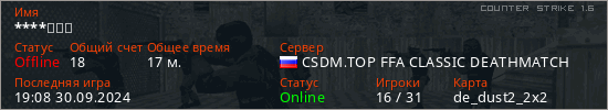 Играет на Counter Strike 1.6 сервере. Страна: РоссияПервый раз замечен 13:27 10.08.2024