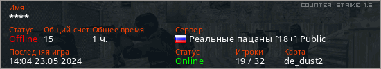 Играет на Counter Strike 1.6 сервере. Страна: РоссияПервый раз замечен 17:14 14.07.2023