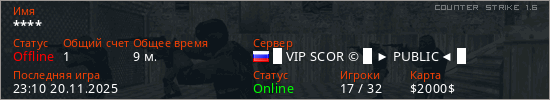 Играет на Counter Strike 1.6 сервере. Страна: РоссияПервый раз замечен 01:31 14.11.2025