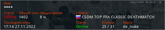 Играет на Counter Strike 1.6 сервере. Страна: РоссияПервый раз замечен 18:19 01.02.2020