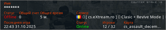 Играет на Counter Strike 1.6 сервере. Страна: РумынияПервый раз замечен 22:38 31.10.2025