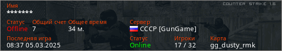 Играет на Counter Strike 1.6 сервере. Страна: РоссияПервый раз замечен 11:52 28.08.2023