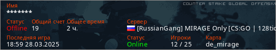 Играет на Counter Strike Global Offensive сервере. Страна: РоссияПервый раз замечен 17:22 28.03.2025