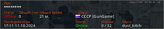 Играет на Counter Strike 1.6 сервере. Страна: РоссияПервый раз замечен 05:47 09.06.2024