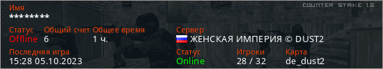 Последний раз был в сети 15:28 05.10.2023 Игрок с таким ником замечен на 15 серверах