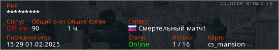Играет на Counter Strike 1.6 сервере. Страна: РоссияПервый раз замечен 10:42 01.12.2024