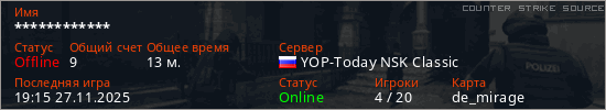 Играет на Counter Strike Source сервере. Страна: РоссияПервый раз замечен 18:11 25.11.2025