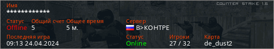 Играет на Counter Strike 1.6 сервере. Страна: РоссияПервый раз замечен 09:11 24.04.2024
