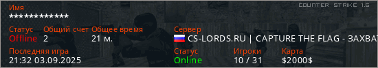 Последний раз был в сети 21:32 03.09.2025 Игрок с таким ником замечен на 10 серверах