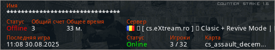 Играет на Counter Strike 1.6 сервере. Страна: РумынияПервый раз замечен 15:47 27.10.2024