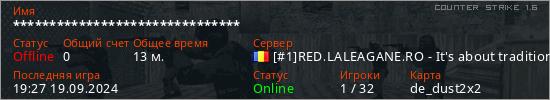 Играет на Counter Strike 1.6 сервере. Страна: РумынияПервый раз замечен 19:23 21.07.2024