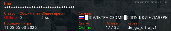 Играет на Counter Strike 1.6 сервере. Страна: РоссияПервый раз замечен 11:06 05.03.2026