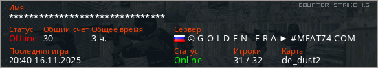 Играет на Counter Strike 1.6 сервере. Страна: РоссияПервый раз замечен 05:25 27.08.2023