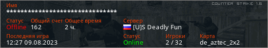 Играет на Counter Strike 1.6 сервере. Страна: РоссияПервый раз замечен 20:15 12.01.2023