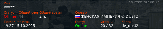 Играет на Counter Strike 1.6 сервере. Страна: РоссияПервый раз замечен 10:19 13.11.2021
