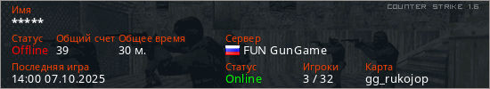 Играет на Counter Strike 1.6 сервере. Страна: РоссияПервый раз замечен 21:14 28.01.2024