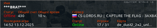 Играет на Counter Strike 1.6 сервере. Страна: РоссияПервый раз замечен 17:36 14.08.2021