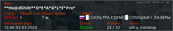 Играет на Counter Strike 1.6 сервере. Страна: РоссияПервый раз замечен 11:35 27.02.2026