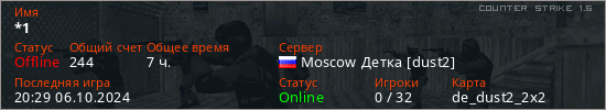 Играет на Counter Strike 1.6 сервере. Страна: РоссияПервый раз замечен 21:18 11.04.2022