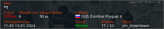 Играет на Counter Strike 1.6 сервере. Страна: РоссияПервый раз замечен 10:53 07.01.2024