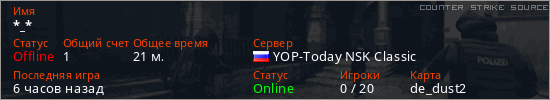 Играет на Counter Strike Source сервере. Страна: РоссияПервый раз замечен 17:25 16.01.2026