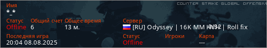 Играет на Counter Strike Global Offensive сервере. Страна: РоссияПервый раз замечен 14:39 22.04.2025