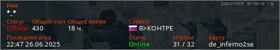 Играет на Counter Strike 1.6 сервере. Страна: РоссияПервый раз замечен 10:40 15.02.2020