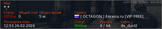 Играет на Counter Strike Source сервере. Страна: РоссияПервый раз замечен 12:41 26.02.2026