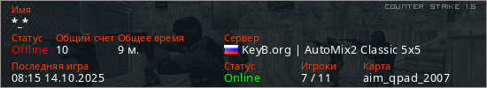 Играет на Counter Strike 1.6 сервере. Страна: РоссияПервый раз замечен 07:42 28.09.2025