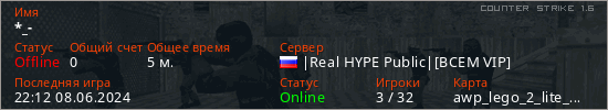 Играет на Counter Strike 1.6 сервере. Страна: РоссияПервый раз замечен 22:02 08.06.2024