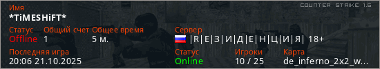 Играет на Counter Strike 1.6 сервере. Страна: РоссияПервый раз замечен 20:04 21.10.2025