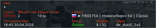 Играет на Counter Strike 1.6 сервере. Страна: РоссияПервый раз замечен 14:00 19.04.2026
