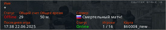 Играет на Counter Strike 1.6 сервере. Страна: РоссияПервый раз замечен 15:49 21.02.2023