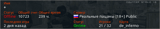 Играет на Counter Strike 1.6 сервере. Страна: РоссияПервый раз замечен 12:22 06.01.2023