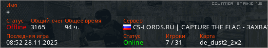 Играет на Counter Strike 1.6 сервере. Страна: РоссияПервый раз замечен 15:19 22.10.2020
