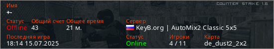Играет на Counter Strike 1.6 сервере. Страна: РоссияПервый раз замечен 22:11 14.07.2025
