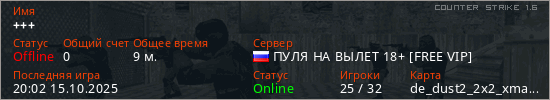 Играет на Counter Strike 1.6 сервере. Страна: РоссияПервый раз замечен 12:58 15.10.2025