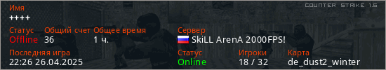 Играет на Counter Strike 1.6 сервере. Страна: РоссияПервый раз замечен 16:53 22.12.2022