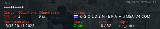 Играет на Counter Strike 1.6 сервере. Страна: РоссияПервый раз замечен 13:25 20.11.2023