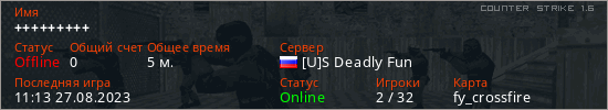 Играет на Counter Strike 1.6 сервере. Страна: РоссияПервый раз замечен 11:11 27.08.2023