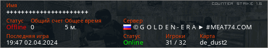 Играет на Counter Strike 1.6 сервере. Страна: РоссияПервый раз замечен 19:45 02.04.2024